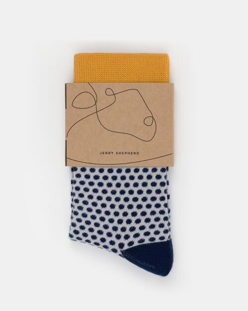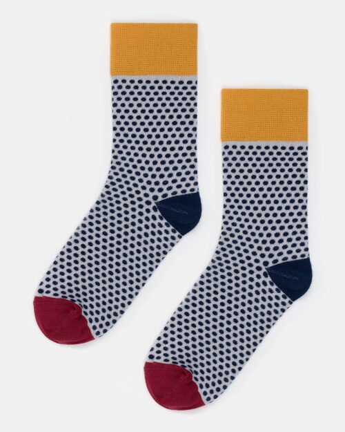 Socks are designed for women and men. A flat seam on the fingers and a non compressive ribbing ensure comfort of use. Gray socks with navy blue dots.