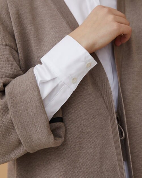 Cozy loose fit shirt from 100% cotton fabric with one rounded pocket in front. Essential piece features classic shirt collar, front button fastening, signature woven label, sleeves with buttoned cuffs and rounded hem.