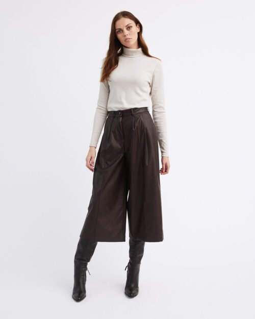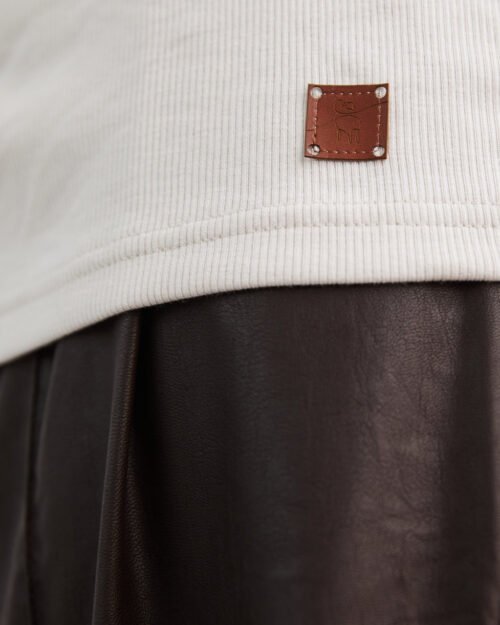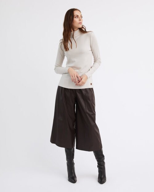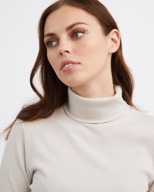 Fitted turtleneck made of cotton modal, long sleeves, ribbed texture. Eco-leather tab with JERRY SHEPHERD logo.