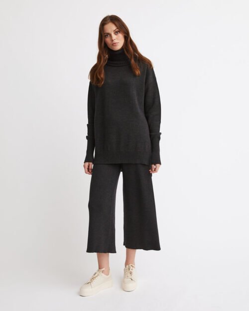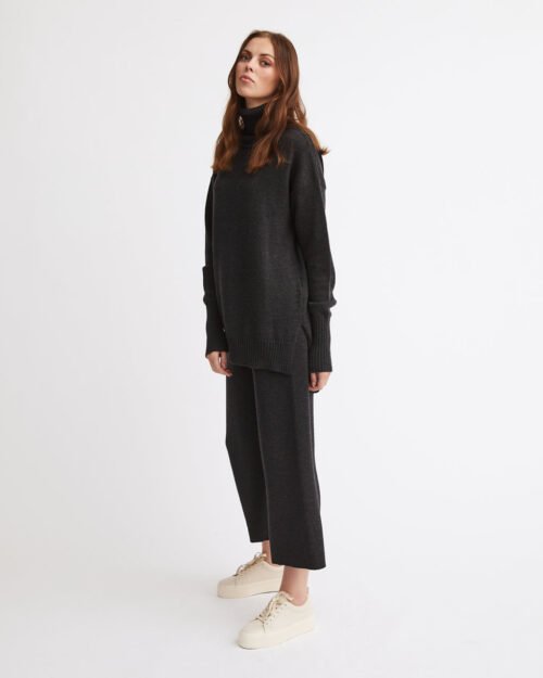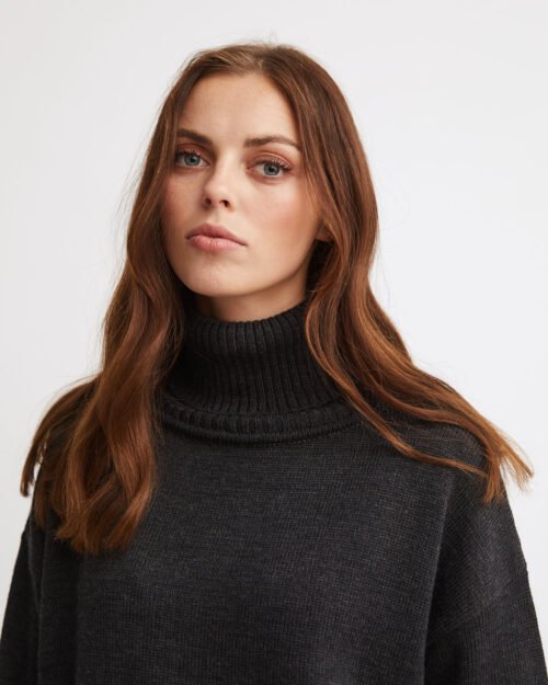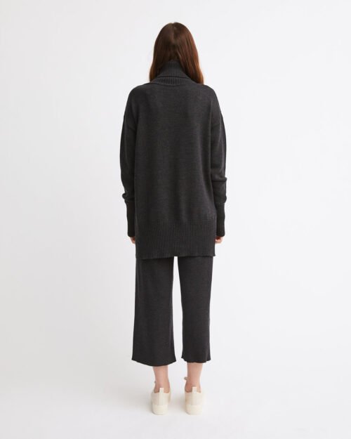 This Turtle-neck sweater knitted from Italian 100% Extra fine merino wool. Featuring two side splits and fitted sleeves. It’s also smart sweater for all weather creating a contemporary look for all modern women.
