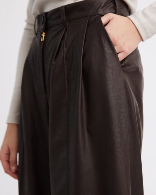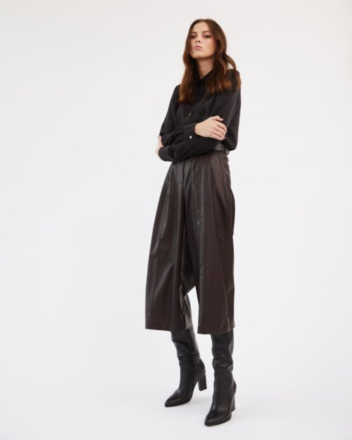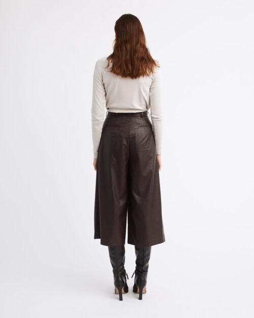 Vegan leather cullote trousers with a slim fit and high waist. Features flared legs with a mid-calf crease, zip fastening and press stud fastening.