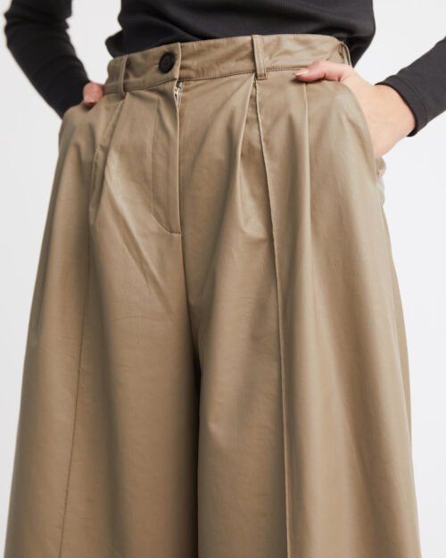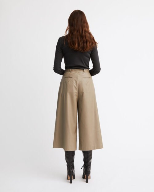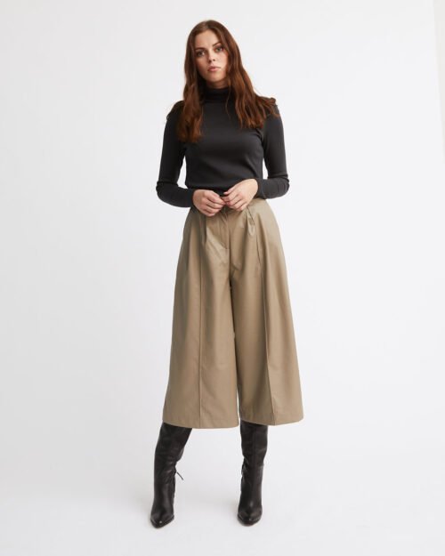 Vegan leather cullote trousers with a slim fit and high waist. Features flared legs with a mid-calf crease, zip fastening and press stud fastening.