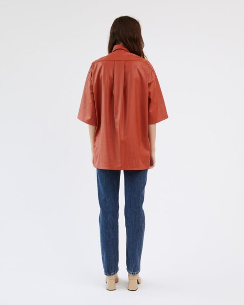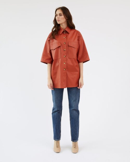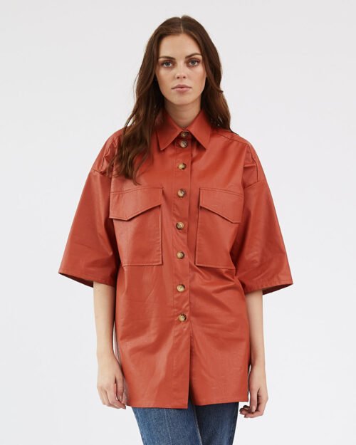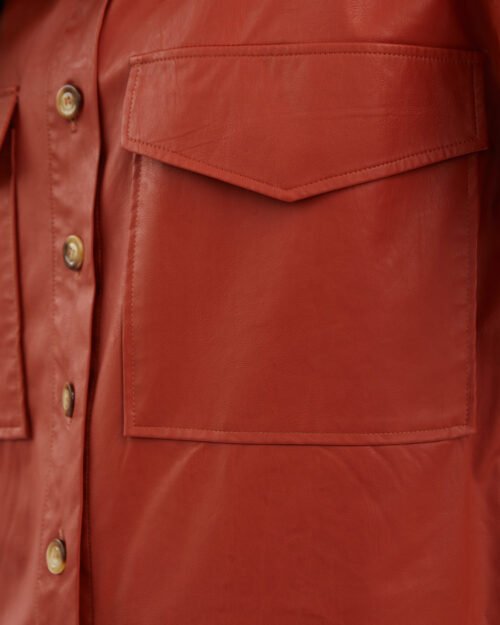 Luźna, oversizowa koszula wykonana ze skóry wegańskiej. Klasyczny kołnierz, duże kieszenie, obniżona linia ramion.