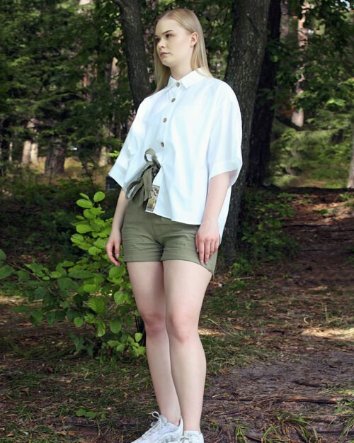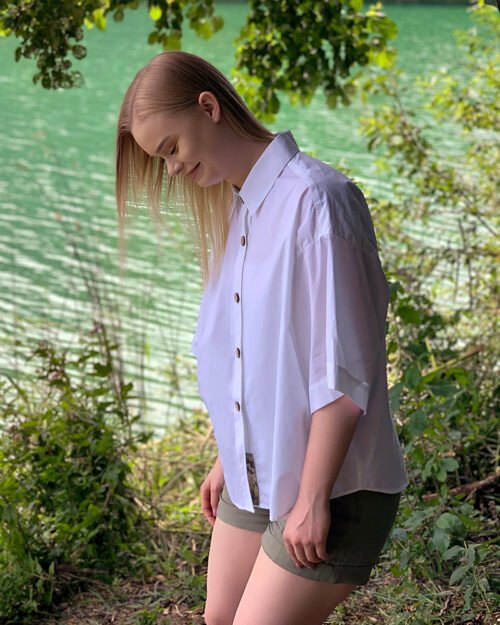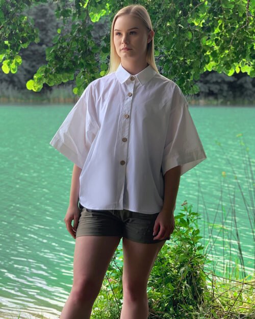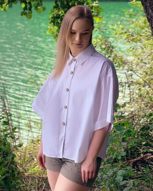 Wygodna koszula o kroju oversize z okrągłym kołnierzykiem oraz rękawem o długości ¾, zapięcie z przodu na guziki, charakterystyczna tkana etykieta. Klasyczna koszula z przewiewnej bawełny organicznej w nowoczesnym wydaniu.