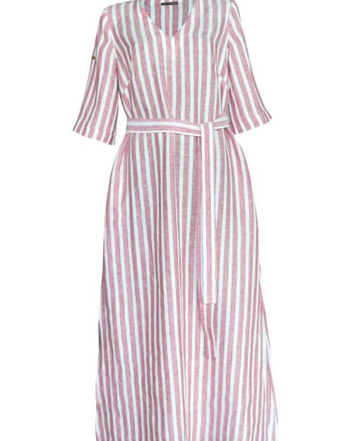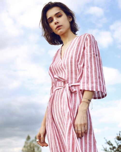 Sukienka lniana o luźnym kroju, kieszenie na szwie, wycięcia po bokach na wysokości ud. Pięknie dopasowuje się do różnych typów sylwetki. Wykonana z lnu europejskiego pochodzącego ze zrównoważonych upraw. Nawadniany w naturalny sposób, uprawy są przyjazne dla środowiska