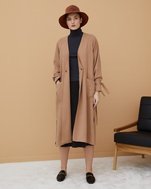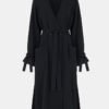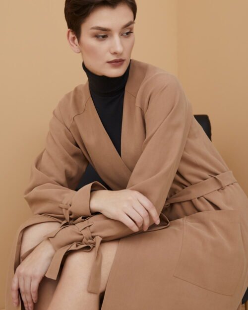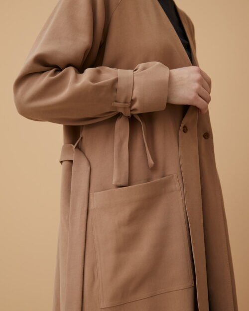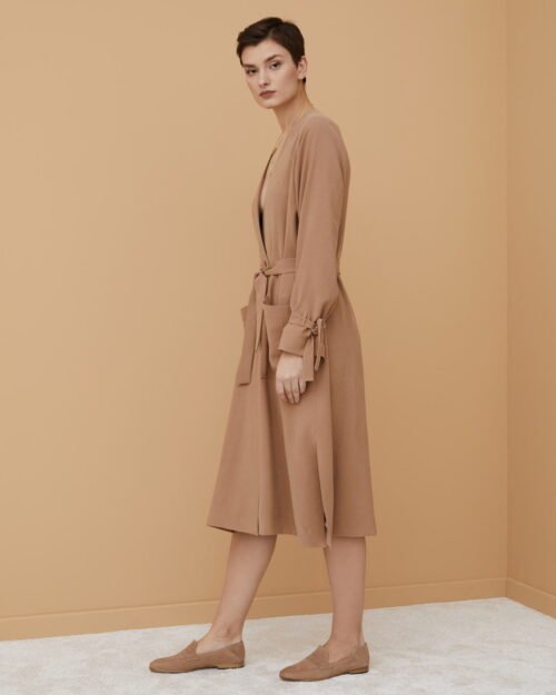 Sukienka o linii A z delikatnej tkaniny rayon. Posiada dekolt w kształcie V, dwurzędowy przeplatany przód z kwadratowymi kieszeniami, pasek do wiązania i szlufki, rękawy z paskiem i szlufkami, podszewka wiskozowa.