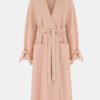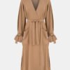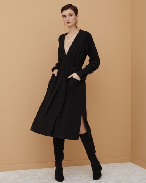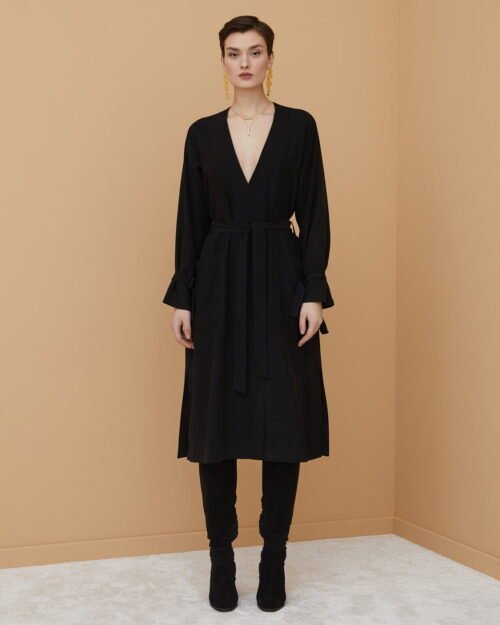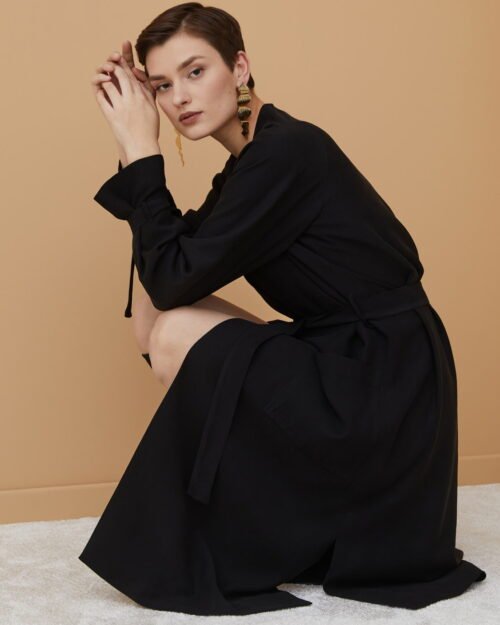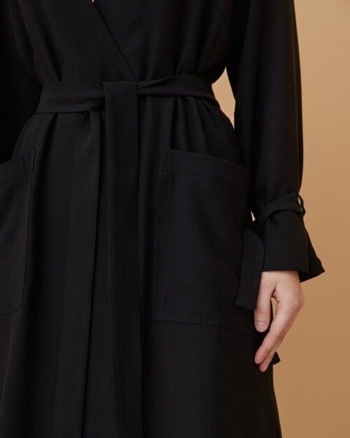 Sukienka o linii A z delikatnej tkaniny rayon. Posiada dekolt w kształcie V, dwurzędowy przeplatany przód z kwadratowymi kieszeniami, pasek do wiązania i szlufki, rękawy z paskiem i szlufkami, podszewka wiskozowa.