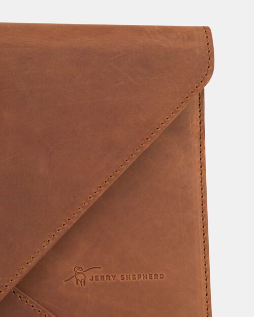 Torba na laptopa w kolorze miedzianym wykonana z wysokiej jakości skóry bydlęcej garbowanej roślinnie typu crazy horse. Skóra o niejednolitym kolorze, posiada liczne przebarwienia oraz naturalne niedoskonałości dodające torbie niepowtarzalnego charakterystycznego efektu starzenia. Logo owcy w postaci podpisu wykonanego jedną linią oraz JERRY SHEPHERD tłoczone po prawej stronie torby.